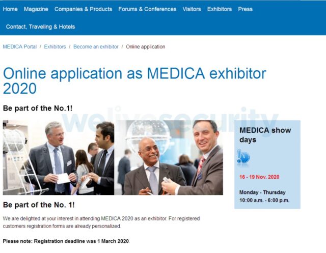 “Los atacantes también imitaron un sitio web perteneciente a la feria comercial MEDICA del Foro Mundial de Medicina celebrada en Düsseldorf, Alemania. Los operadores clonaron el sitio web original y agregaron un pequeño fragmento de código JavaScript. Es probable que los atacantes no pudieran comprometer el sitio web legítimo y tuvieran que configurar uno falso para inyectar su código malicioso”, dice Faou.