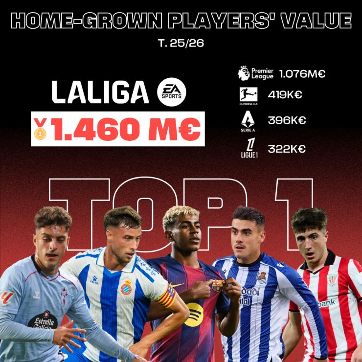 El análisis sitúa a LALIGA como la competición con mayor valor de mercado total de canteranos en Europa, alcanzando los 1.460 millones de euros. Esta cifra supera con holgura a la Premier League (1.070 M€), la Bundesliga (960 M€), la Serie A (890 M€) y la Ligue 1 (760 M€). En la última ventana de fichajes (verano de 2025), los clubes españoles generaron 289 millones de euros en operaciones vinculadas al talento local, un récord histórico que confirma el éxito de la estrategia.